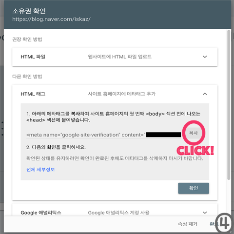 - 주소입력 후 계속버튼 누르면 소유권 확인 작업을 위해 메타태그를 본인 블로그 html에 붙여넣는 작업을 해야함.