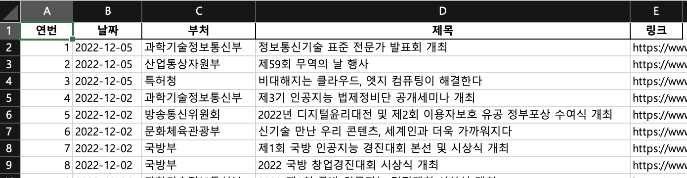 - 연번, 날짜, 부처, 기사 제목, 링크