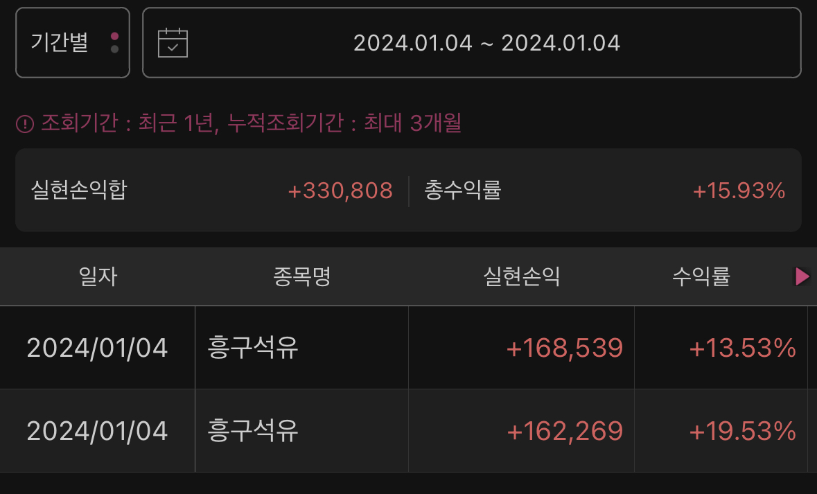 | [매매일지] 📈 2024. 1. 11.(목) 단기매매 (롯데정보통신 수익) (0) | 2024.01.11 |